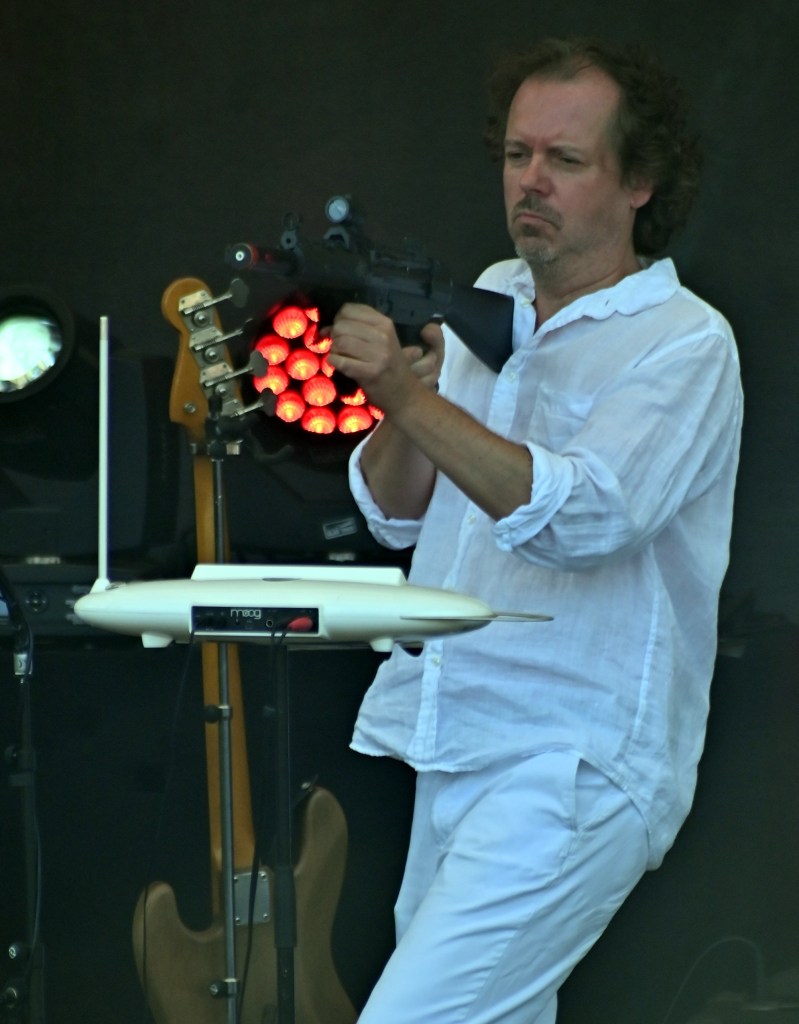 Fritz Rappel plays keys and is seen here strafing the audience with a machine gun which he’s using to drive a theremin.